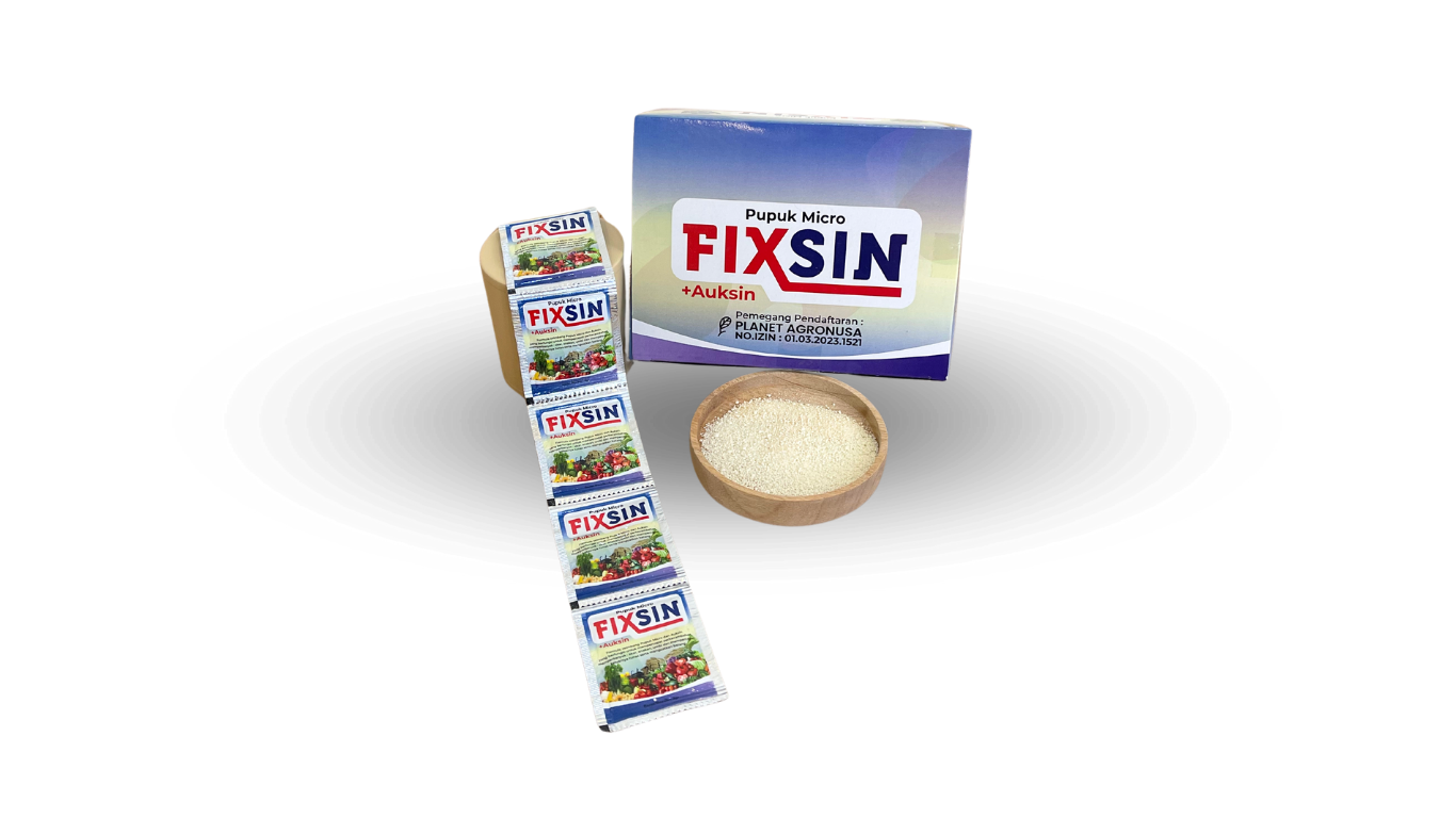 FIXSIN merupakan formula seimbang pupuk Micro dan Auksin yang berfungsi untuk mempercepa perkecambahan, memperbanyak : Akar, anakan, umbi dan keluarnya tunas serta menguatkan batang.